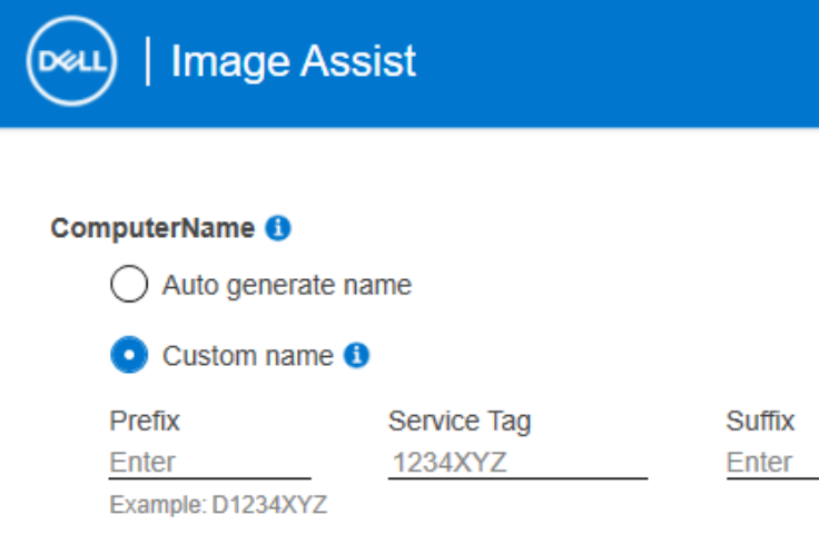 Custom Name: Here, you can add a prefix or suffix to the Dell service tag, with a max of 15 characters. Note: If a prefix or suffix is not added, a “D” will be prepended to the service tag to prevent all-numeric service tags from breaking Windows, which does not support all numeric computer names.