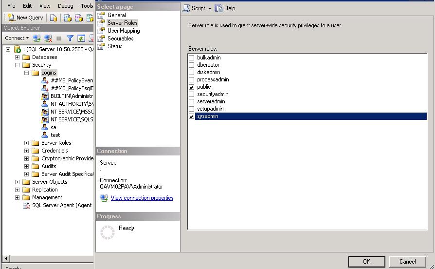 4. Create a new user with “db_owner” , “sysadmin” and “public” privileges