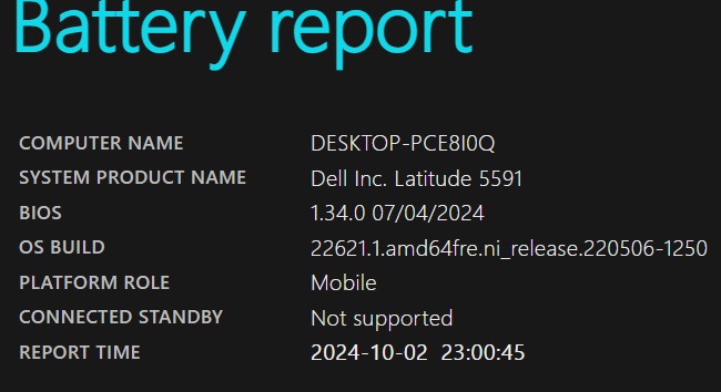 I generated a battery report, which shows that Connected Standby: "Not Supported", and the laptop still isn’t charging. Could you please help me troubleshoot and find a solution to this problem?
