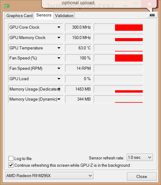 Through there, play a game windowed (or fullscreen if you have two monitors) and keep track of the data on the r9 m295x on HWMonitor. You should also look at the CPU's speed as well (should be below powers).