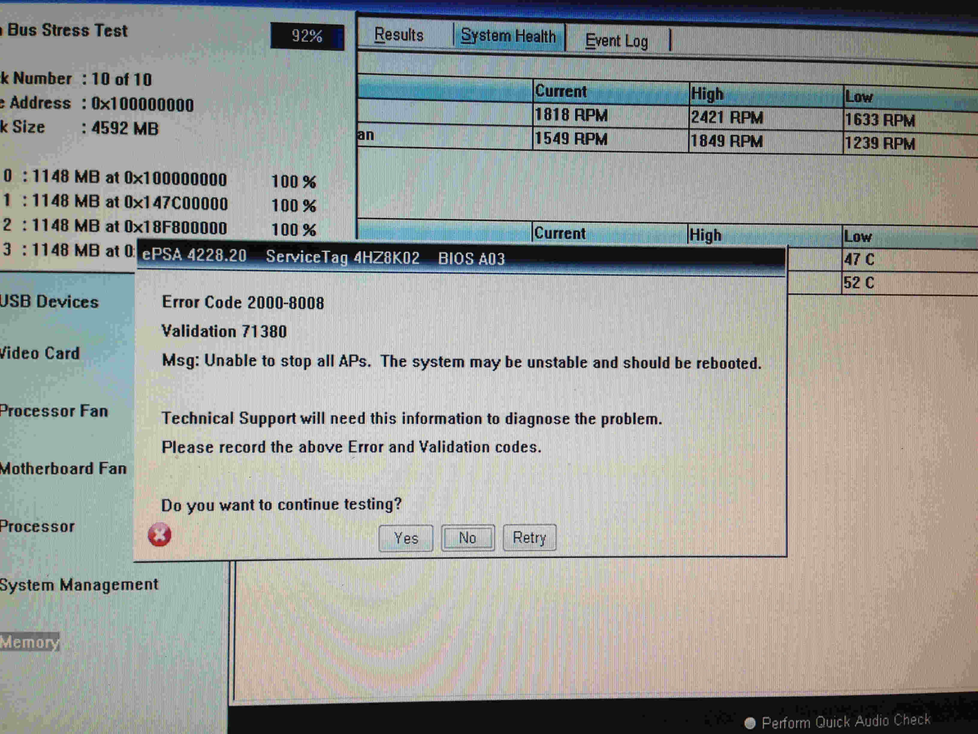 Ran the DELL diags over the course of 2 days and at one point the diags stopped and received this message:
