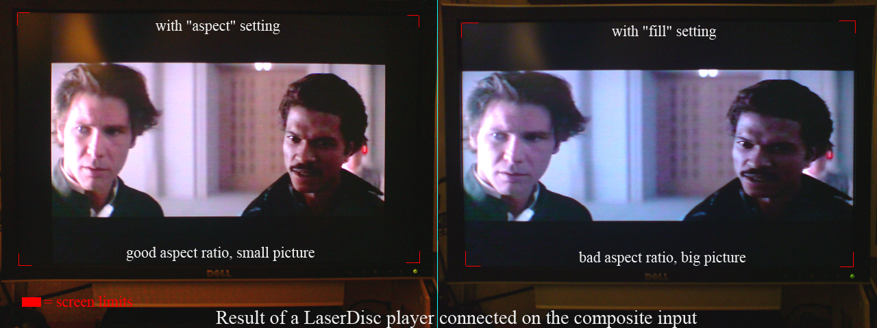 It's impossible to get a correct aspect ratio in full screen on the video inputs (S-Video or Composite).