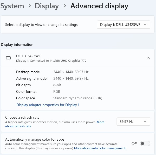 Hello, I just bought a Dell SFF 7010(2023) and a U3423WE , but I couldn't make them work at 10 bit color depth. I also put in a 01KNYY HDMI Card to get the HDMI 2.1. The display is setting at 3440x1440 60Hz 32bit, but neighter the DP1.4 nor the HDMI2.1 can make my U3423WE work at 10 bit.