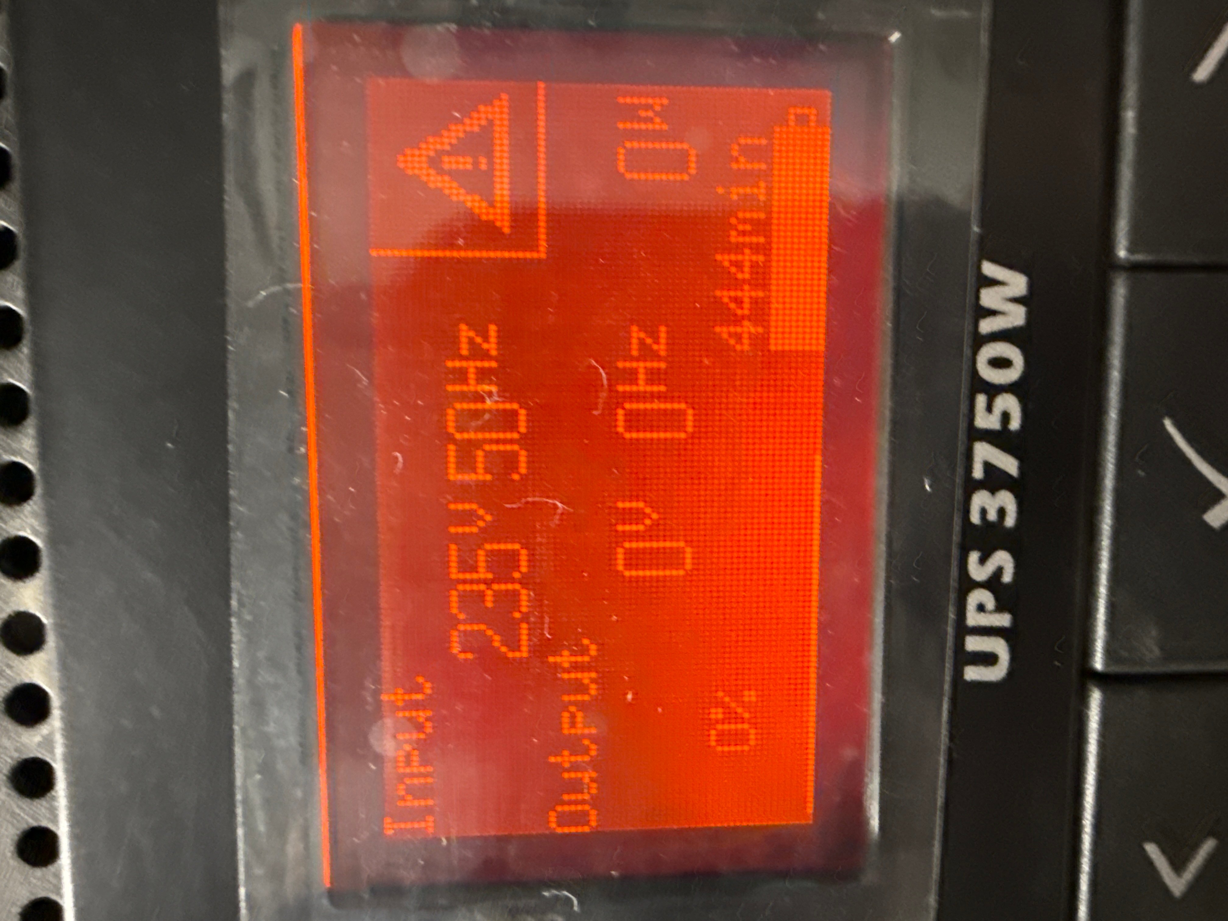 HI ALL, I HAVE THE ERROR ABOVE ON A UPS 3750R , NEED HELP , I HAVE 0v ON OUTPUT 0% 444 MIN (battery) what can i do?