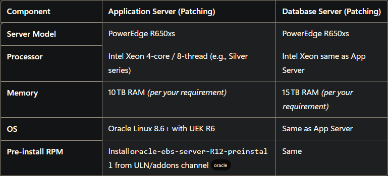 I need support on Configuration for Oracle EBS R12 on Oracle Linux 8X (Application & Database Server). The no of user's connecting this Server is minimum as this is patching instance only. Please suggest a latest hardware configuration oracle provided hardware list. We prefer Intel Processor with 4C/8T with memory 10T for Application Server and 15T for Database Server.
