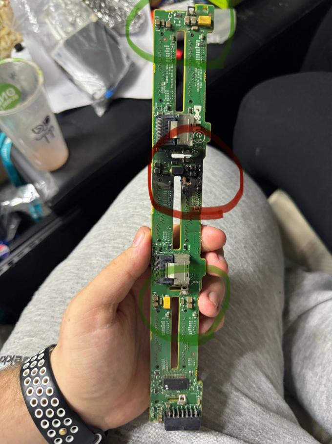 Hi Joey C thanks for the response! I think the fire may have been caused by a few exploding capacitors on the sas back plane when we was investigating where the burning was coming from when we powered the server back up the whole burnt area began sparking and burning immediately the only thing we could think has caused it is maybe some of the bad small capacitors we noticed that each sata section seems to have one I’ve attached the photos and have circled in red the area where the fire seems to have started and have circled in green the same components on the bored in the other group I believe these may be responsible for power handling for the drives but what baffles me is the set that has caught fire didn’t actually have any drives on that section