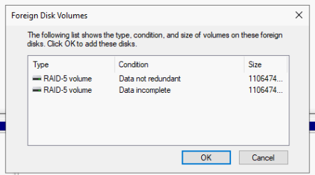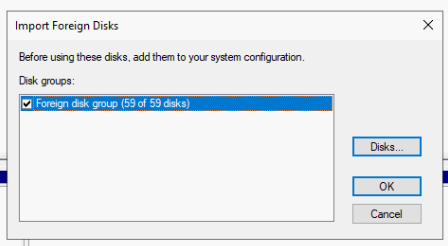 It is loaded with 60 4TB drives and at some point in time it was configured with 2 x RAID 5 Arrays. All disks are present in Windows Disk Management but all report as Dynamic and Foreign.