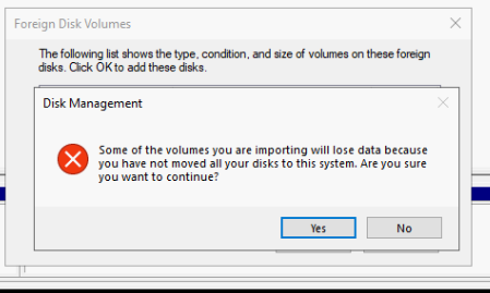 If I try to import a disk in Windows Disk Managemwent, I get the message below.