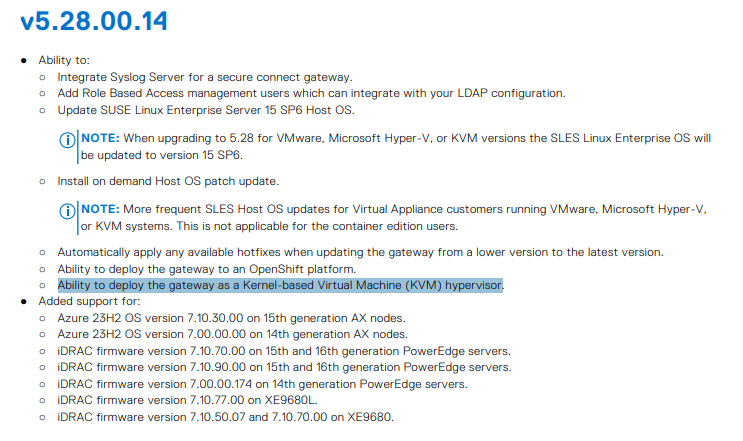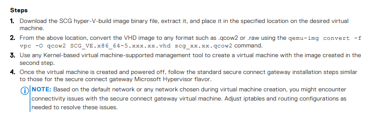 Deploying SCG (Secure Connect Gateway) on a KVM environment isn’t officially supported by Dell. It’s designed for VMware, Hyper-V, and certain cloud platforms. While you can sometimes get it running on KVM with nested virtualization or by converting the OVA image, Dell won’t provide technical support for issues. For production, it’s safer to use a validated hypervisor.