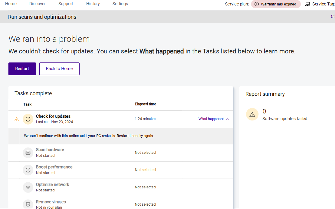 Dell Support Assistant software is not working properly. I believe it is related to a recent BIOS update. The message "We Can't continue with this action until your PC restarts. Restart, then try again." continually appears when checking for updates. Restarting the system results in the same message.