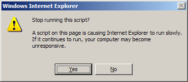 "A script on this page is causing Internet Explorer to run slowly. If it continues to run, your computer may become unresponsive."