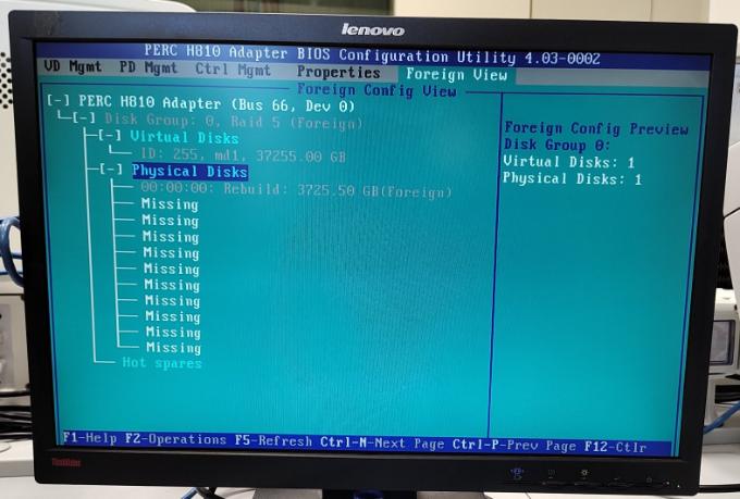 Il menù del controller riporta una "Foreign configuration" su uno dei dischi, uno risulta failed e gli altri 10 dischi dell'array risultano tutti "Missing".