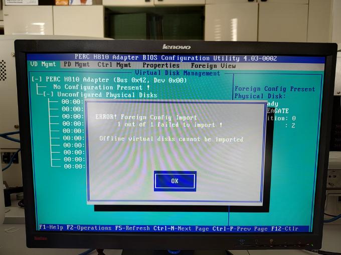 Per evitare di perdere altri dati, non fare nulla che scriva nuovi dati sui dischi, come l'inizializzazione o la creazione di nuove configurazioni RAID. Il messaggio di errore suggerisce che non funziona, forse a causa di metadati corrotti o di una mancata corrispondenza nella configurazione del disco fisico. Se si dispone di un disco sostitutivo compatibile per il disco guasto, provare a sostituirlo per vedere se l'array diventa accessibile o parzialmente recuperabile. Configurazione estranea” significa che il controller ha trovato dischi con metadati RAID che non corrispondono alla configurazione attuale. Ciò potrebbe derivare da una vecchia configurazione o da un'impostazione RAID incompleta.