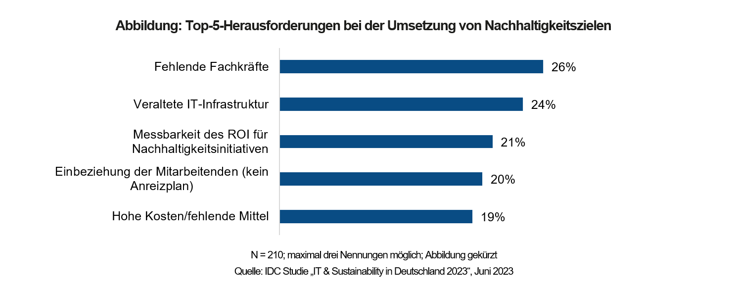 Wo Ziele sind, sind immer auch Herausforderungen. Der Mangel an Fachkräften bzw. an Fachwissen ist die größte Hürde für die Unternehmen. IDC sieht das kritisch, denn zum einen fehlen die Fachkräfte, um nachhaltigkeitsfördernde Projekte umzusetzen, und zum anderen wird das Nachhaltigkeitsprofil eines Unternehmens den Studienergebnissen zufolge zunehmend zu einem wichtigen Entscheidungskriterium für neue Talente (59 Prozent). Eine weitere große Herausforderung stellen veraltete IT-Infrastrukturen dar. D. h., Legacy-IT ist häufig nicht nur aufwendig zu betreiben, sondern kann dazu beitragen, dass nachhaltige Initiativen gar nicht erst umgesetzt werden können. Mit einer modernisierten, digitalisierten und von Beginn an nachhaltig gestalteten IT-Infrastruktur kann und sollte man hier unbedingt gegensteuern, um die geplanten Ziele zu erreichen.