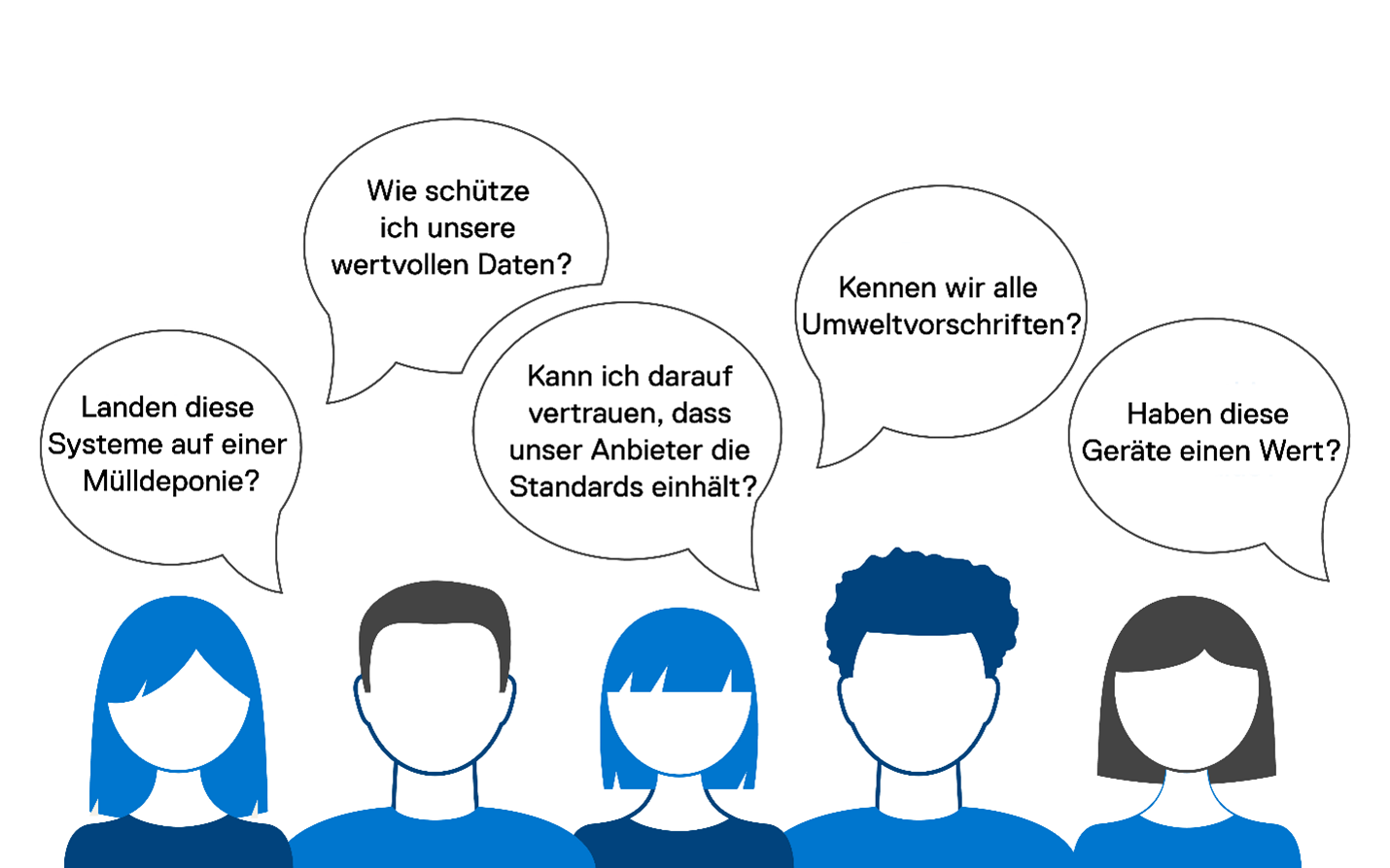 Wir bei Dell Technologies verstehen Ihre Bedenken. Die Entsorgung von IT-Geräten, die das Ende der Nutzungsdauer erreicht haben, kann eine Herausforderung sein. Neben dem Umgang mit komplexen Logistik- und IT-Lebenszyklusproblemen kann die Bewältigung der Risiken im Zusammenhang mit Datensicherheit und Umwelthaftung Schwierigkeiten bereiten. Manchmal mag es einfacher erscheinen, alternde Geräte auf den Schreibtischen der MitarbeiterInnen stehen zu lassen und weiter abzuschreiben oder ungenutzte technische Geräte nach dem Motto „aus den Augen, aus dem Sinn“ im Lager aufzubewahren, wo sie wertvollen Platz beanspruchen.