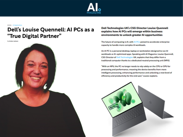Louise Quennell, Dell Technologies CSG Director in the UK recently explored this issue and more in an exclusive interview with Amber Jackson at AI Magazine. In the piece, Louise discusses the advantages of AI PCs over cloud-based AI services, the challenges to overcome, the enhancements they bring, and the future of AI PCs in the workplace.