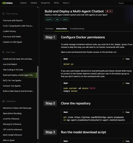 This playbook is a guided set of steps for deploying a multi‑agent chatbot using containers, models, and configuration files curated by NVIDIA.