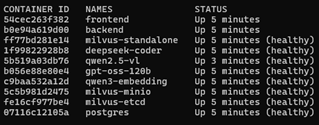 You’ll see a table listing container IDs, names, and statuses. At first, some containers may be starting or downloading images; give it time until they all show as “healthy” or “up” in the status column.
