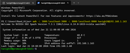 Figure 6: PowerShell window on a remote laptop showing the SSH command with port forwarding to the GB10.
