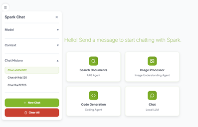 You should see the Spark Chat UI, a web interface where you can interact with the multi‑agent chatbot and switch between different modes, including “Chat / Local LLM” and image processing.
