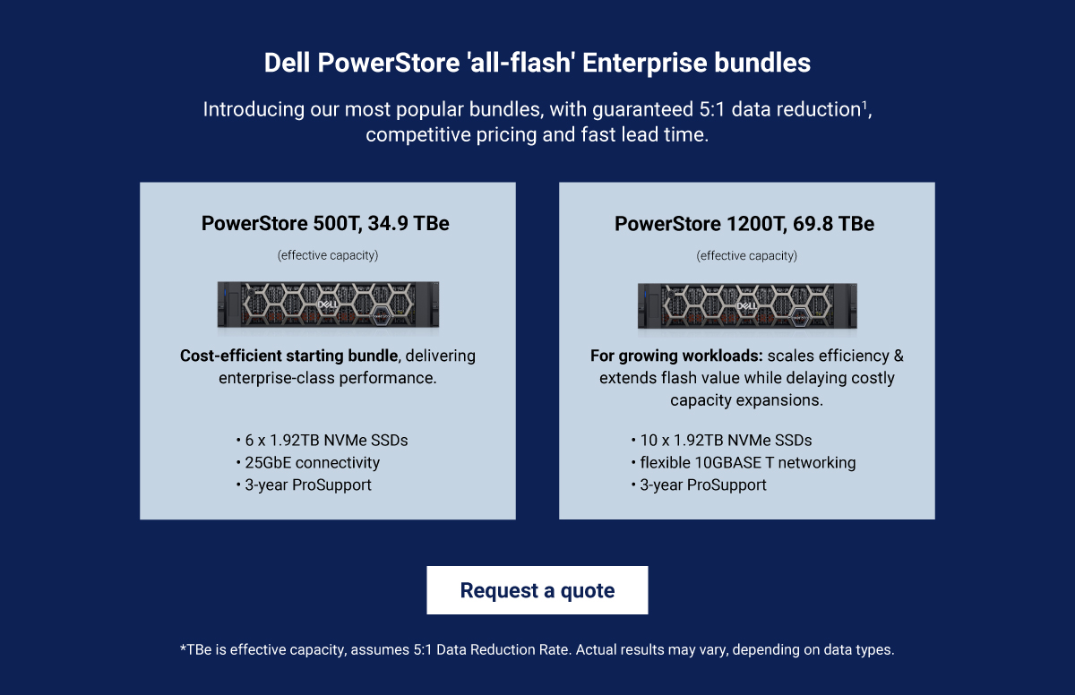 1Storage Data Reduction Guarantee: Applicable products include PowerStore and PowerMax All-Flash Storage products as indicated in the Terms and Conditions. Requires minimum purchase of ProSupport for Infrastructure 4hour or NBD support agreement, a ProSupport Plus for Infrastructure support agreement, a ProSupport One for Data Center 4-hour or NBD support agreement or a valid support contract with a valid Dell support partner. For more information contact your Dell sales representative.