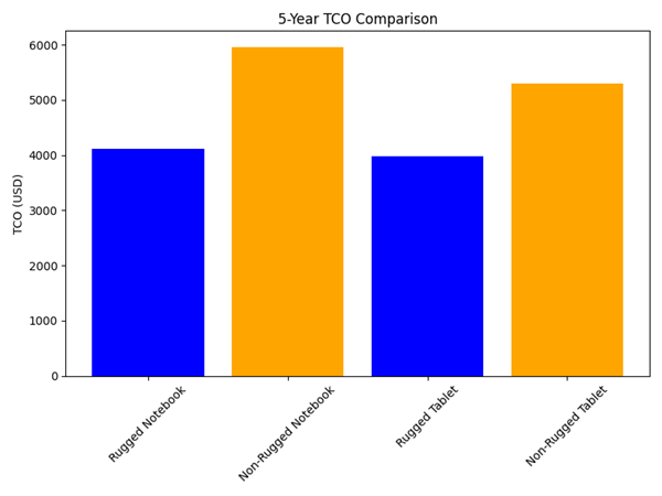 Rugged notebooks and tablets cost 30–40% less over five years than their non-rugged counterparts.