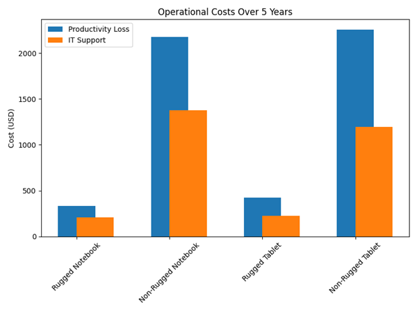 Logistics Fleet: Drivers and warehouse staff using rugged notebooks report fewer delays. Lost productivity per device failure falls from 74 minutes to under 30. IT support costs drop by 60%. Devices last nearly twice as long.
