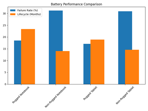 - Battery performance: Non-rugged notebooks fail to last a shift 31.2% of the time, compared to 18.5% for rugged notebooks.