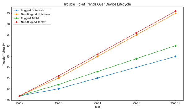 2. Trouble Tickets: The Long-Term View: The company tracks trouble tickets over the device lifecycle. The difference is clear: Rugged devices maintain reliability year after year, while non-rugged devices see escalating issues, thus reducing the cost required to support the devices.