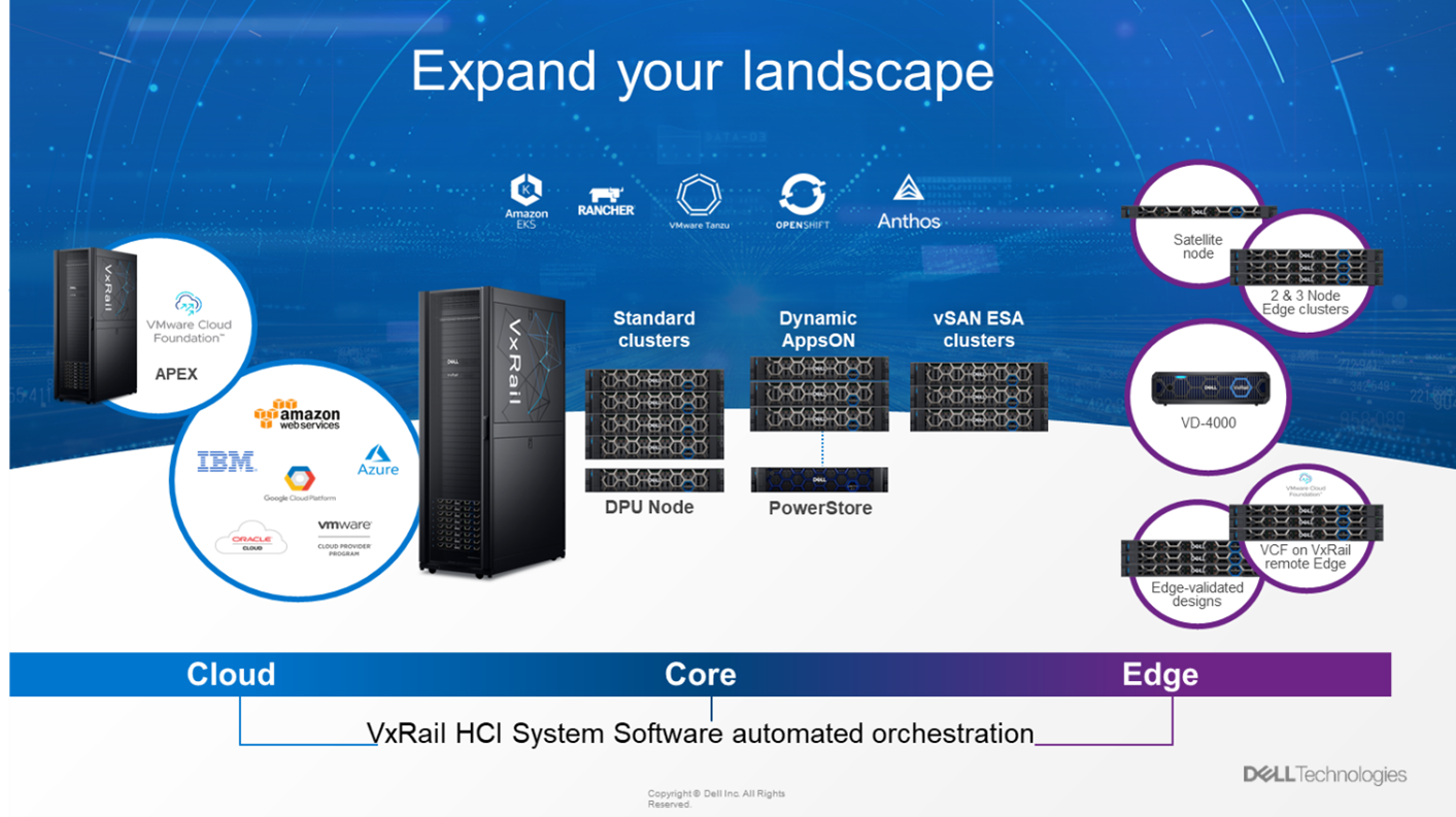 Un des bénéfices majeurs de VxRail est d’apporter une cohérence opérationnelle à travers les différents types de déploiements dits core, edge et cloud. Les capacités d’automatisation et d’orchestration sont également des différenciateurs clés qui facilitent l’administration global des clusters et la gestion de l’ensemble du cycle de vie de l’infrastructure. Que vous disposiez d’une architecture vSAN, en mode vSAN Mesh ou simplement des nœuds attachés à un stockage externe, VxRail fournit les mêmes process de maintien en conditions opérationnelles.