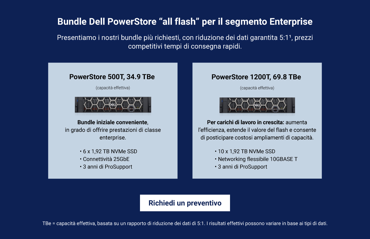 ¹ Storage Data Reduction Guarantee: i prodotti interessati includono le soluzioni di storage All‑Flash PowerStore e PowerMax, come indicato nei termini e condizioni. È richiesto un contratto di supporto minimo (ProSupport for Infrastructure 4 ore o NBD, ProSupport Plus for Infrastructure, ProSupport One for Data Center 4 ore o NBD o un contratto di supporto valido con un partner di supporto Dell autorizzato). Per maggiori informazioni, contattate il vostro rappresentante commerciale Dell.
