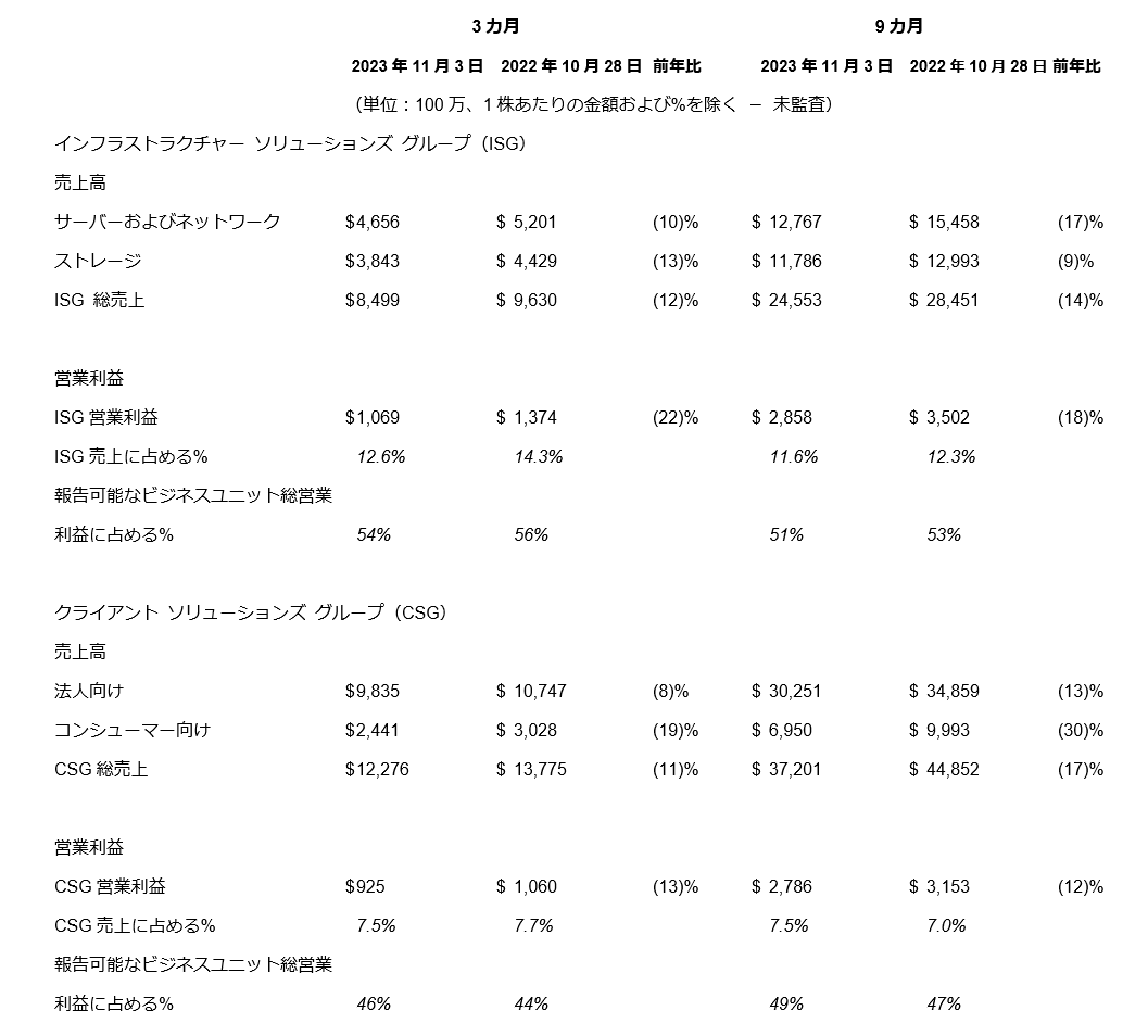 クライアント ソリューションズ グループ(以下、CSG)の第3四半期の売上高は、前年同期比11%減、前期比5%減の123億ドルでした。法人向けPCの売上高は98億ドル、コンシューマー向けの売上高は24億ドルで、営業利益は9億2,500万ドルでした。
