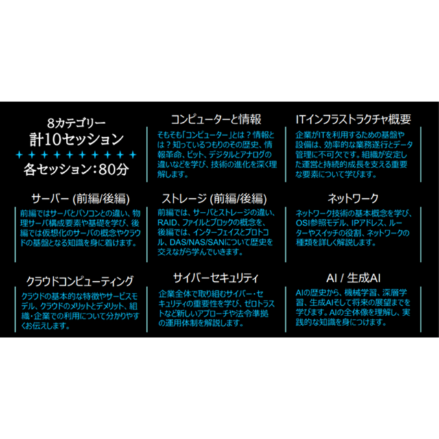 【総合コース】1 「コンピューターと情報」、2 「ITインフラストラクチャー概要」、3 サーバー(前編/後編)、4 ストレージ(前編/後編)、5 ネットワーク、6 サイバーセキュリティ、7 クラウドコンピューティング、8 AI/生成AI