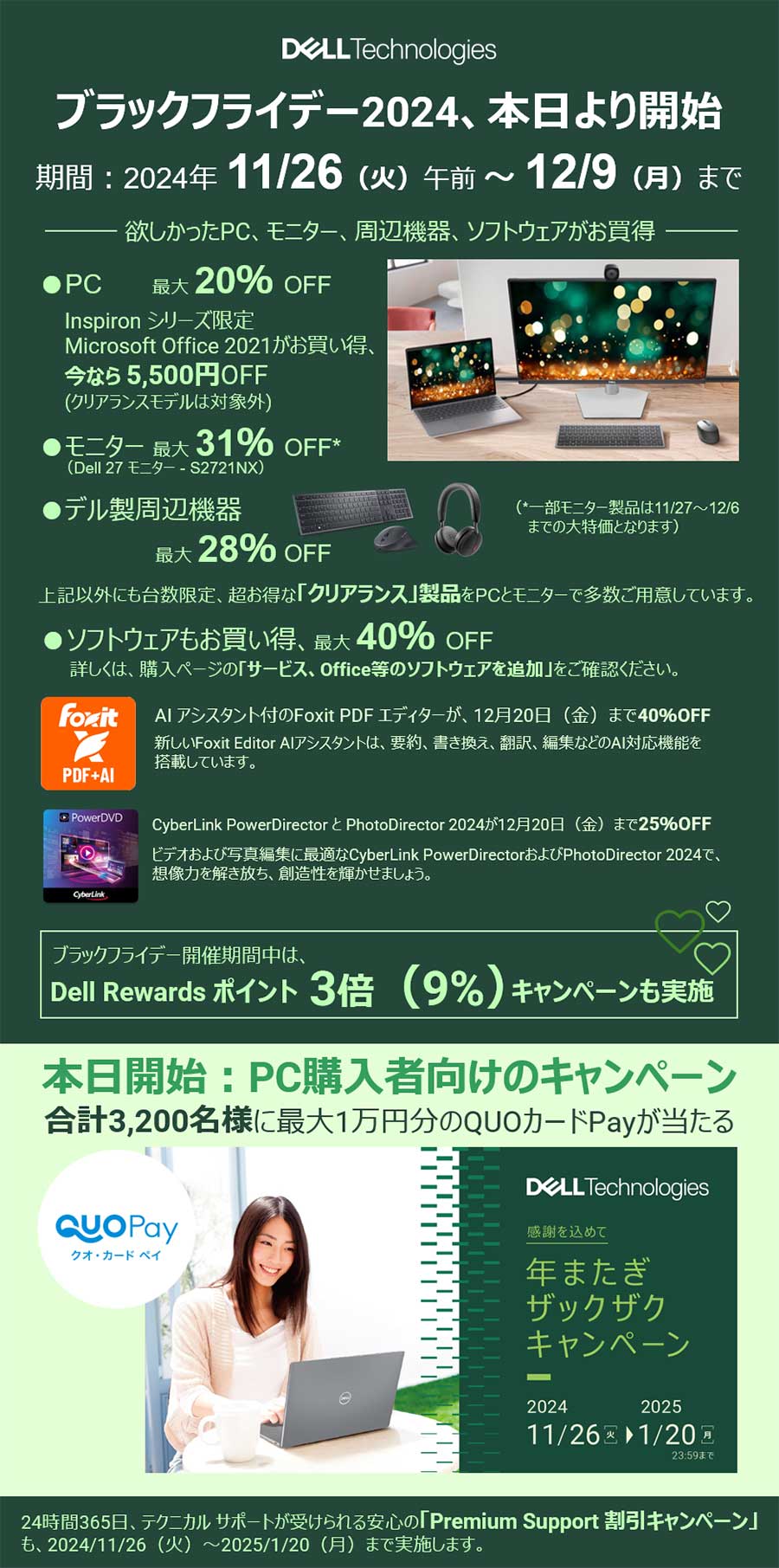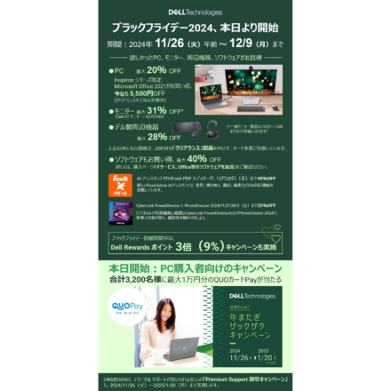 デル・テクノロジーズ株式会社(本社:東京都千代田区、代表取締役社長:大塚 俊彦、以下、デル・テクノロジーズ URL:https://www.dell.com/ja-jp)は、2024年11月26日(火)より12月9日(月)まで、ブラックフライデー2024を開催します。この期間にデル・テクノロジーズの最新PCやGaming PC、モニター、周辺機器をお得に手に入れてください。また対象のデル PC ご購入で、合計3,200名様に最大1万円分のQUOカードPayが抽選で当たる、「感謝を込めて、年またぎ ザックザクキャンペーン」もスタートします。