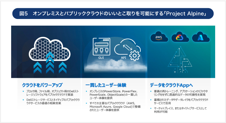 ジャストラブ氏最後が「Project Alpine」です。これは2022年1月のアナウンスで初めて登場した、ストレージソフトウエアをメジャーなパブリッククラウド上で稼働させるというプロジェクト。これによってパブリッククラウドでもオンプレミスの高いグレードのストレージ機能を利用できるようになり、オンプレミスとパブリッククラウドの「いいとこ取り」が可能になります。