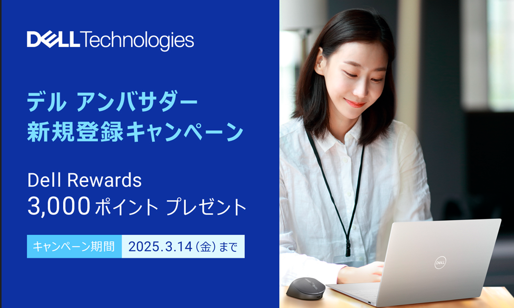 キャンペーン概要:デル アンバサダーに新規登録いただくと、Dell Rewards 3,000ポイントをもれなくプレゼントします。既にデル アンバサダーにご登録頂いている方にも、デル アンバサダーに新規登録される方をご紹介頂き、その方がデル アンバサダーに登録頂ければ、3,000ポイントをプレゼントします。