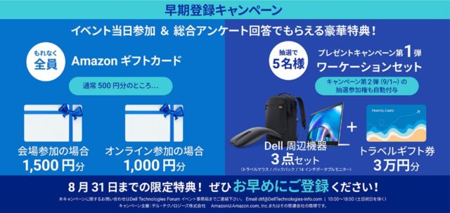 8月31日(日)までに早期登録すると特典が豪華になる、期間限定の早期登録キャンペーンも実施しています。デル・テクノロジーズ製品やギフト券などがもらえる豪華特典に関する詳細は、登録サイトをご参照ください。