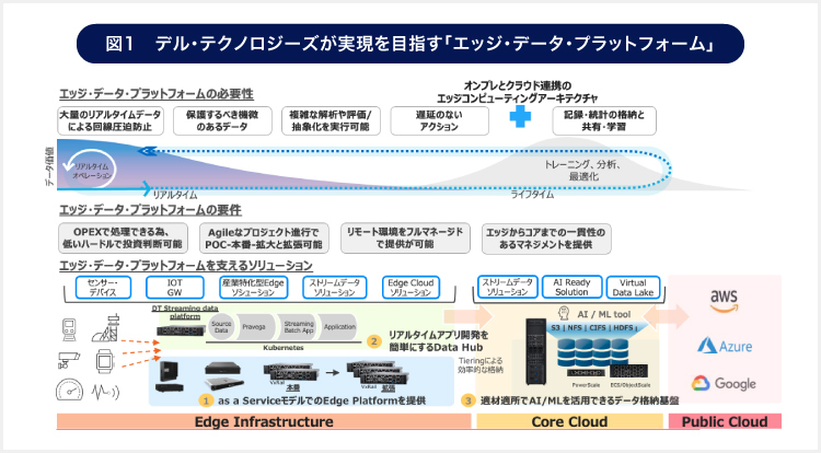 このプラットフォームは、エッジ環境で生成されるデータの収集、蓄積およびエッジでのリアルタイムデータ分析を支援するとともに、エッジで継続的に生成されるデータをコアDCやパブリッククラウドで活用できるようにするためのデータモビリティの簡素化を提供するもの。これによりエッジ/現場での迅速な判断と、コアDC/クラウドでの長期傾向モデルの分析、エンド・ツー・エンドでのデータマネジメントを支援する。