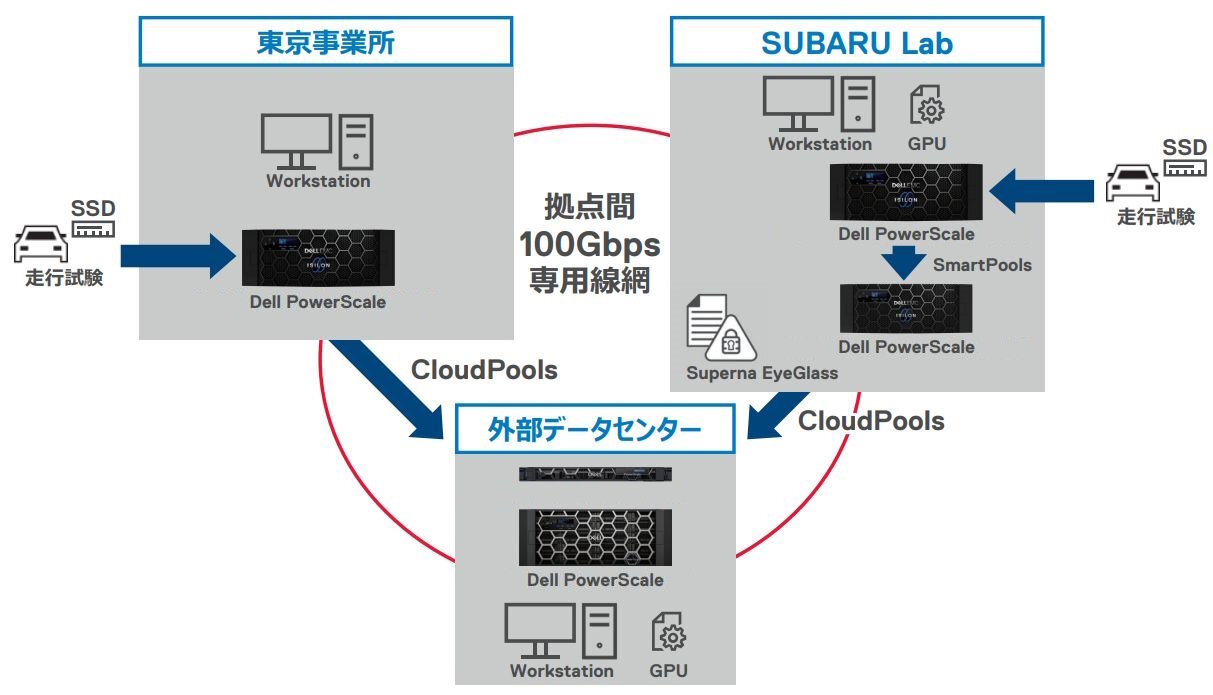 SUBARUは、複数の拠点に、それぞれAI開発用、既存システム用、アーカイブ用としてPowerScaleシリーズを配置。拠点をまたいだクラスタ/階層構造を構築した。また、各拠点を100Gbpsのネットワークでつなぎ、高速にデータを連携させられる環境を整えた。