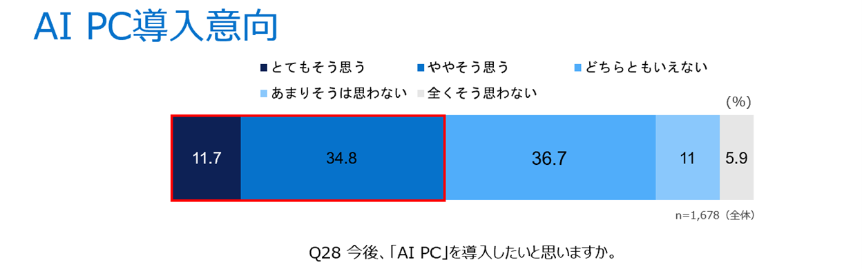 当社が2024年7月に実施したアンケート調査において、「AI PC」の認知度は7.3%*1だったところ、同年10月に実施した今回の調査では70.4%となり、認知度が大きく上がりました。また、導入状況については、すでに導入しているユーザーは7.4%と1割弱にとどまっていますが、導入意向を示したユーザーは46.5%と半数弱を占めており、「AI PC」の導入に前向きなユーザーが多いことがわかりました。