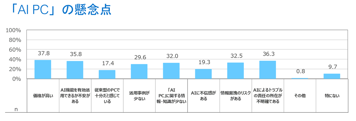 続いて、「AI PC」の導入によって期待することを聞いたところ、「業務効率の向上と精度向上」や「自動化の推進」が上位に上がりました。一方、「AI PC」の導入を検討する際の懸念点については、価格の高さの他に、「AIによるトラブルの責任の所在が不明確である」、「AI機能を有効活用できるか不安がある」、「情報漏洩のリスクがある」など多くの項目が挙がりました。
