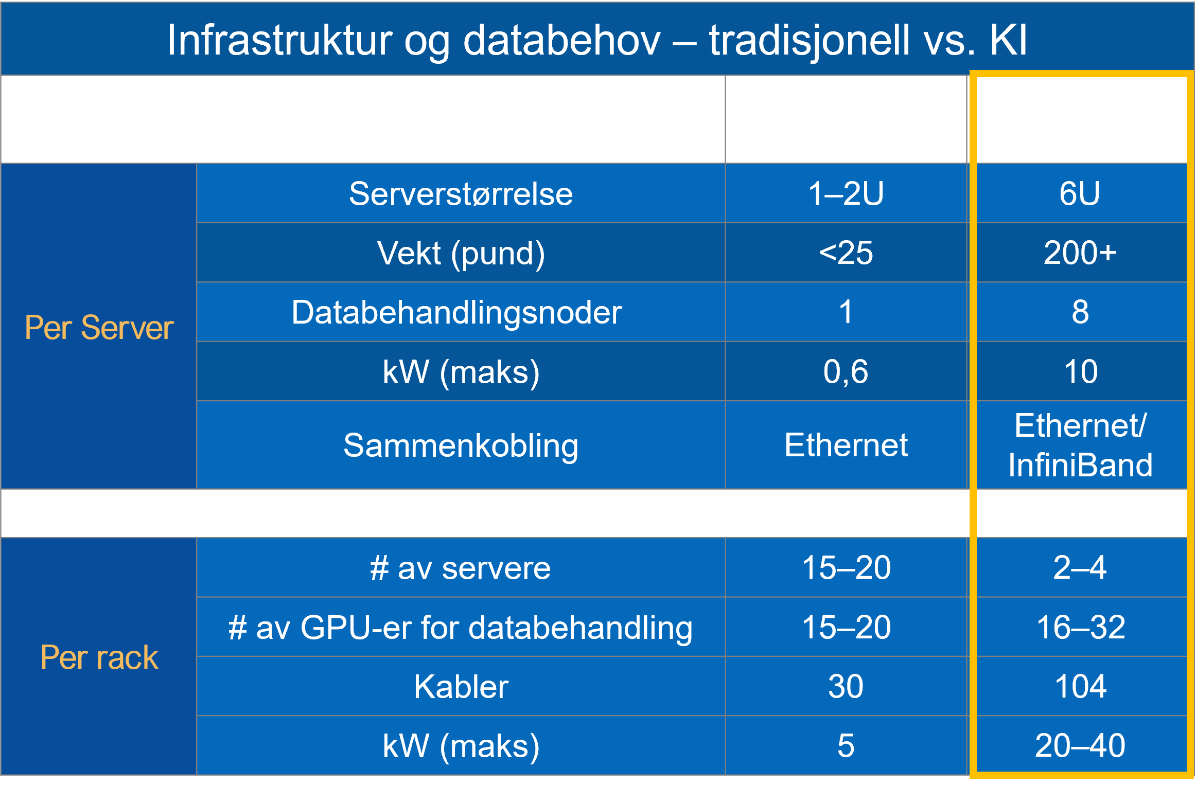 For å innfri disse kravene har GPU-drevne servere med generativ KI langt større spesifikasjoner for fysisk størrelse, vekt, kabling, nettverksbygging, strøm og kjøling enn standardservere. Organisasjoner må planlegge nøye for å implementere denne KI-infrastrukturen i datasentrene sine.