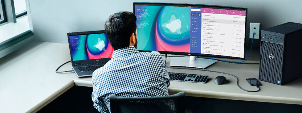 A 34” curved WQHD monitor equipped with the Easy Arrange feature on Dell Display Manager, along with a keyboard and mouse, can increase productivity by 42%.6