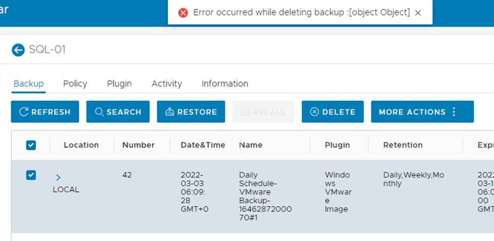 If an attempt is made to delete or change a backup in the Avamar AUI, the error "Error occurred while deleting backup :[object Object]" is displayed: