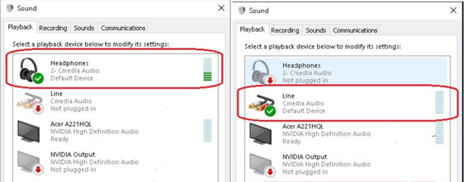 Po připojení zařízení na níže uvedených platformách se ve vlastnostech zvuku zobrazí výchozí zařízení. Označené zařízení se nezmění, když je do zvukového konektoru připojen jiný typ zařízení, zobrazí se jako Sluchátka, pokud jsou připojena k přednímu audio portu, a Line, pokud je připojen zadní audio port, jak je znázorněno na obr. 1.