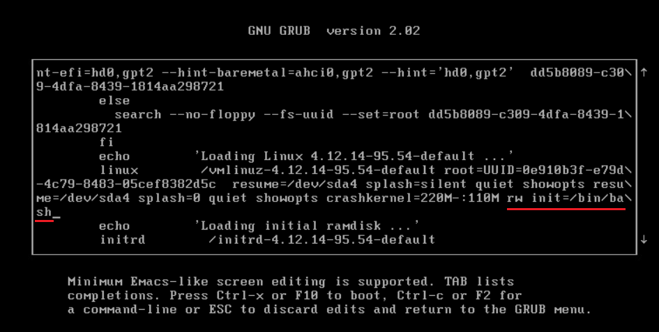 - Tryck på "CTRL+x" för att starta enheten i enanvändarläge med det nya Linux-kärnalternativet.