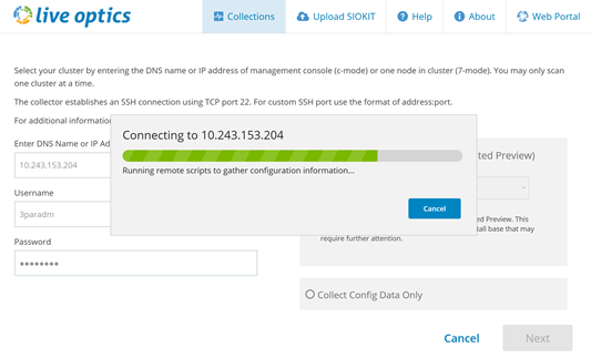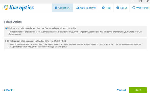 - Selecting the default, "Upload my collection data to the Live Optics web portal automatically" this is the recommended method. Once the collection is complete, the data is automatically uploaded to the Live Optics portal. Use this option when the host running the collector has Internet access