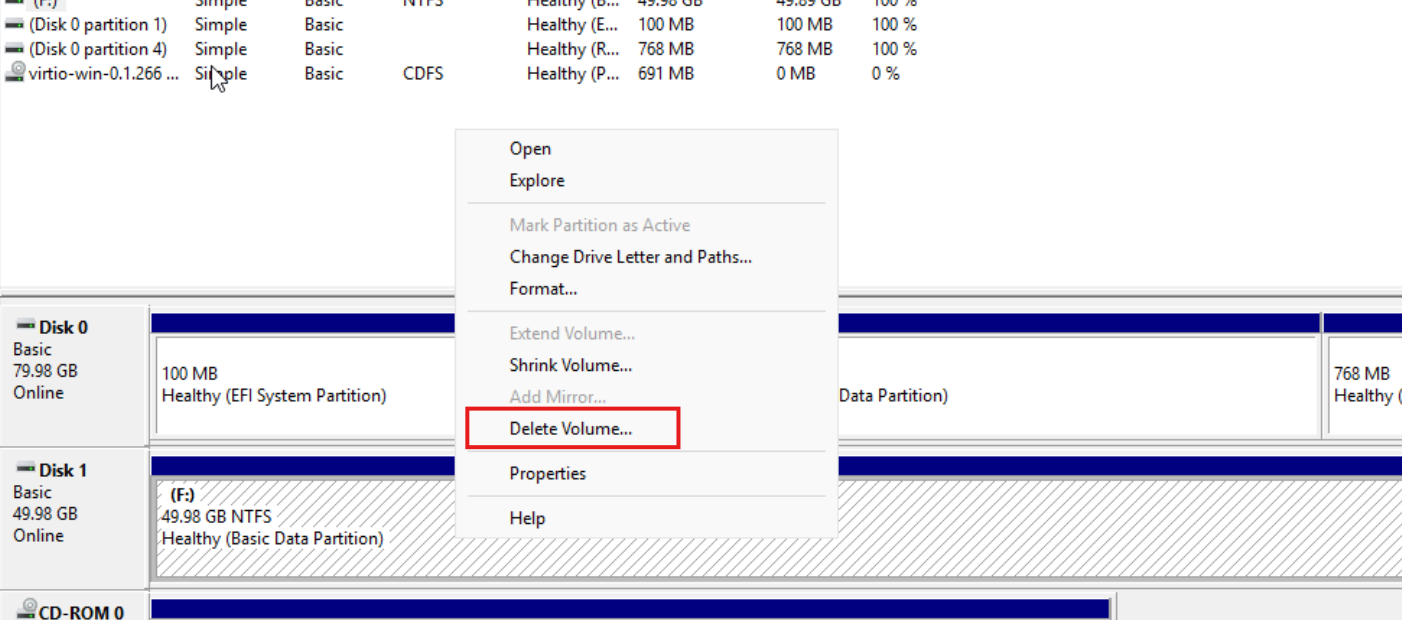 La opción para eliminar una partición de disco en Administración de discos está atenuada y no se puede seleccionar.