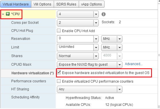 - 受影響的虛擬機器已啟用「向來賓公開硬體輔助虛擬化」設置