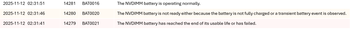 “BAT0021: The NVDIMM battery has reached the end of its usable life or has failed”“BAT0017: The NVDIMM battery has failed.”